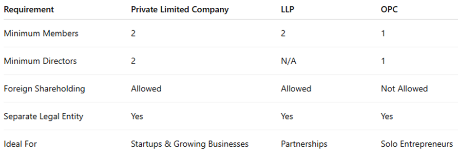 Private Limited Companies offer the most growth flexibility, making them ideal for expanding businesses and startups. LLPs are great for professional partners who want structure but with less compliance. OPC suits solo founders who want legal protection without needing partners. Foreign shareholding is unrestricted in Pvt Ltd and LLP but not in OPC. FilingPoint helps founders choose the right structure based on goals.